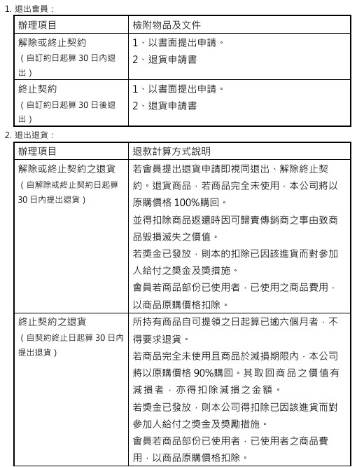 9-2 退出之退貨-解除或終止契約 若會員提出退貨申請即視同退出、解除終止契約。 會員得自訂約日起算30天內,以書面通知本公司解除或終止契約。 本公司於契約解除或終止生效後30日內,接受會員退貨之申請,受領會員送回之商品,並返還 會員購買退貨商品所付價金及其他給付本公司之款項。 現金付款者,以現金退還或以ATM轉帳,若為刷卡,則由刷卡銀行直接退還於持卡人之帳戶 中。 退貨商品,若商品完全未使用,本公司將以原會員價格100%購回。並得扣除商品返還時因可歸 責傳銷商之事由致商品毀損滅失之價值。 若獎金已發放,則本公司得扣除已因該進貨而對參加人給付之獎金及獎勵措施。 會員若商品部份使用及已使用之商品費用,以商品原會員價格扣除之。