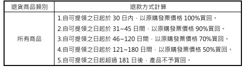 (2)可歸責傳銷商之退貨處理:下列情況者不予受理退換貨 I.蓄意破壞。 II.錯誤使用。 III.存放不當外觀遭毀損。 IV.經拆封已使用而無法重新銷售之產品。 4. 退款程序 退貨時,填具「退貨申請書」,經本公司承辦部門確認退貨附件完備後,本公司會 在退貨手續完成後30日內,完成退款入帳作業。 5. 退出退貨不包含入會費1000元。